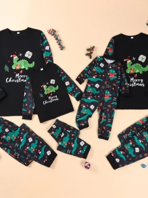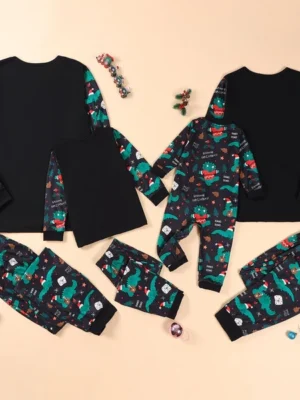 Black Long-Sleeved Dinosaur Patterned Christmas Family Matching Pajama Set