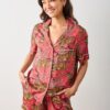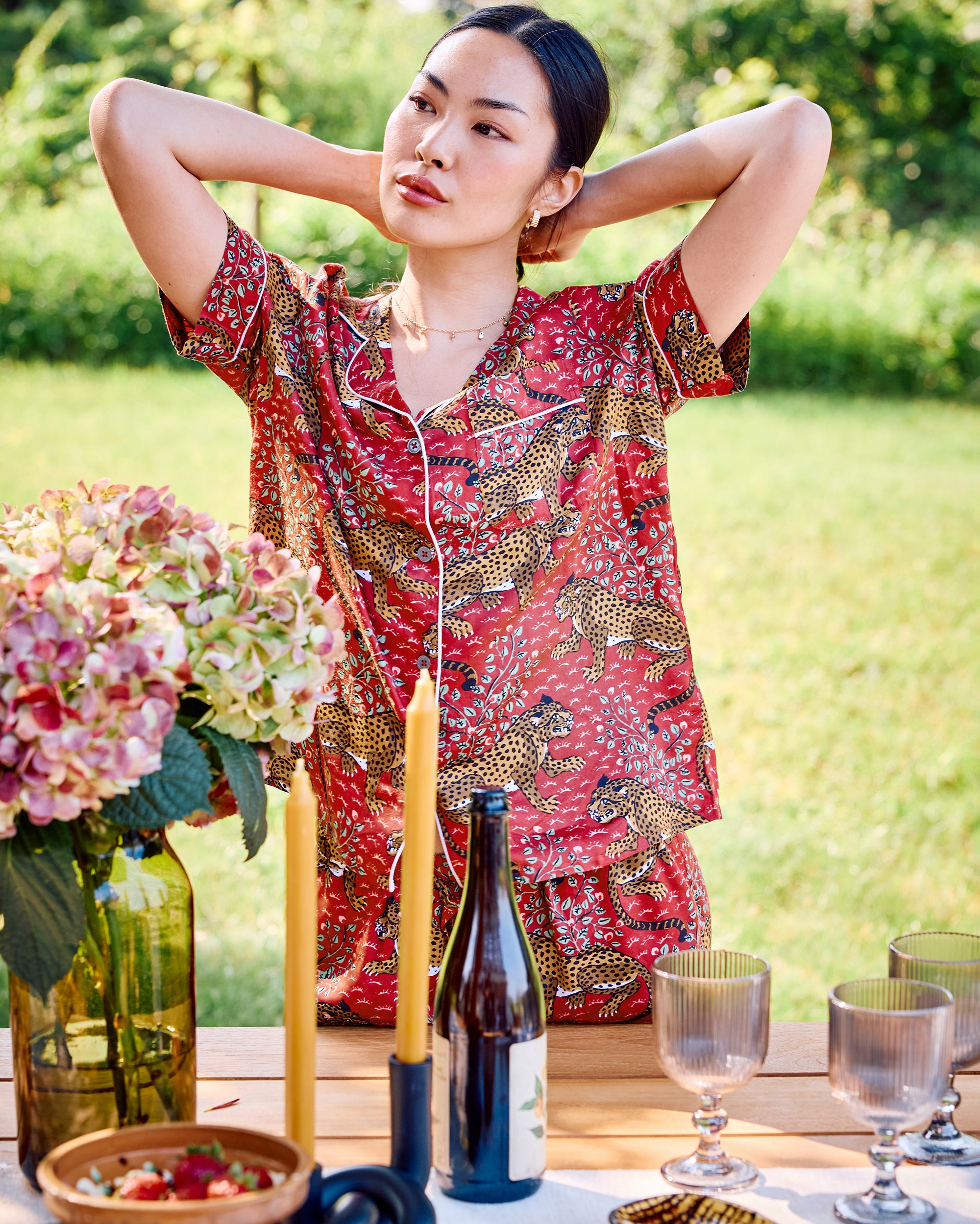 Vintage jungle cat paintings inspire our iconic leopard print shorts set in rich Scarlet. This luxury satin sleepwear features breathable Eco Satin that keeps you comfortable on warm nights. The chic button-down and shorts with pockets create a perfect red pajama short set for channeling your inner feline, whether prowling for midnight snacks or lounging on vacation. Discover more luxe styles in our and .