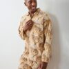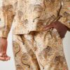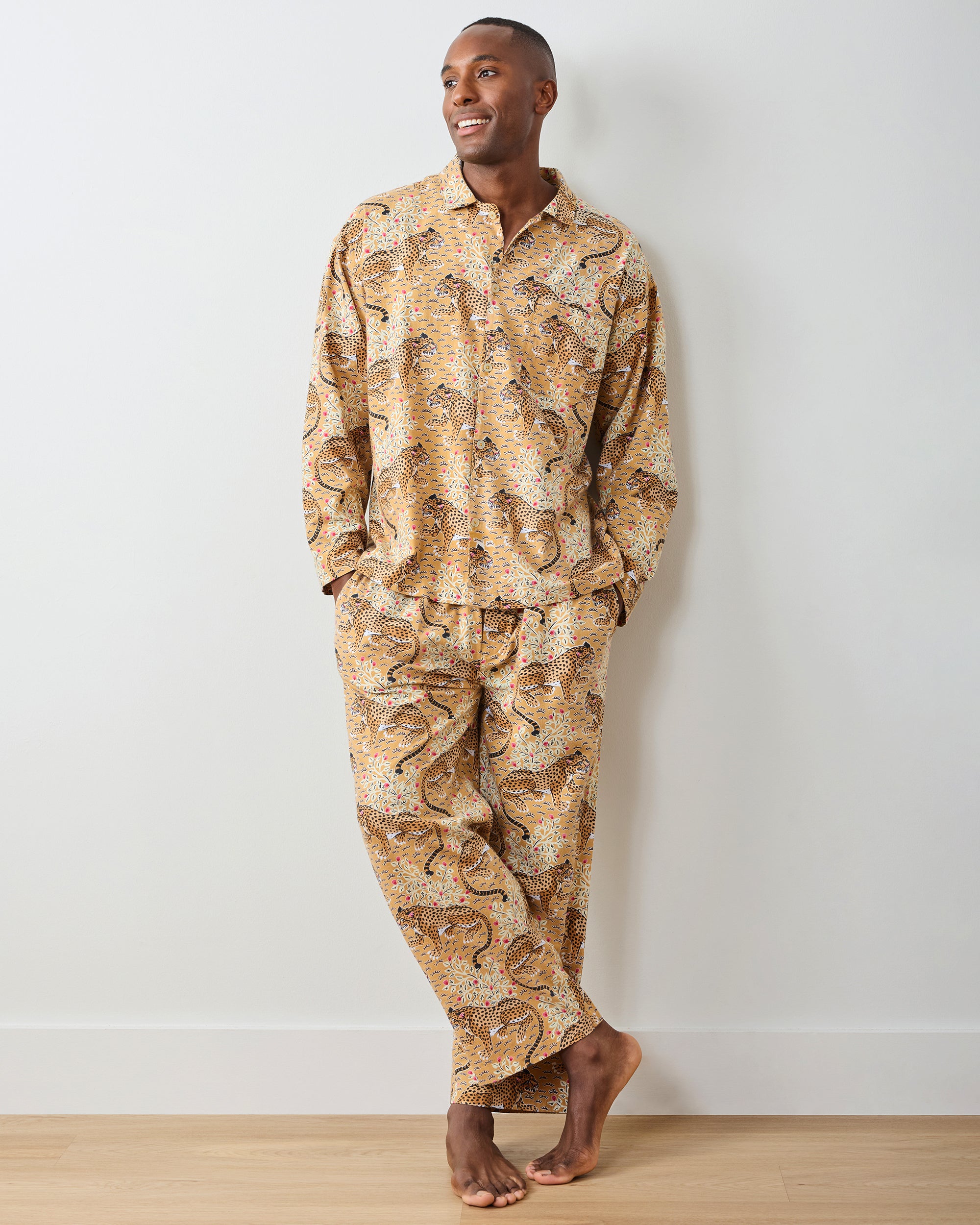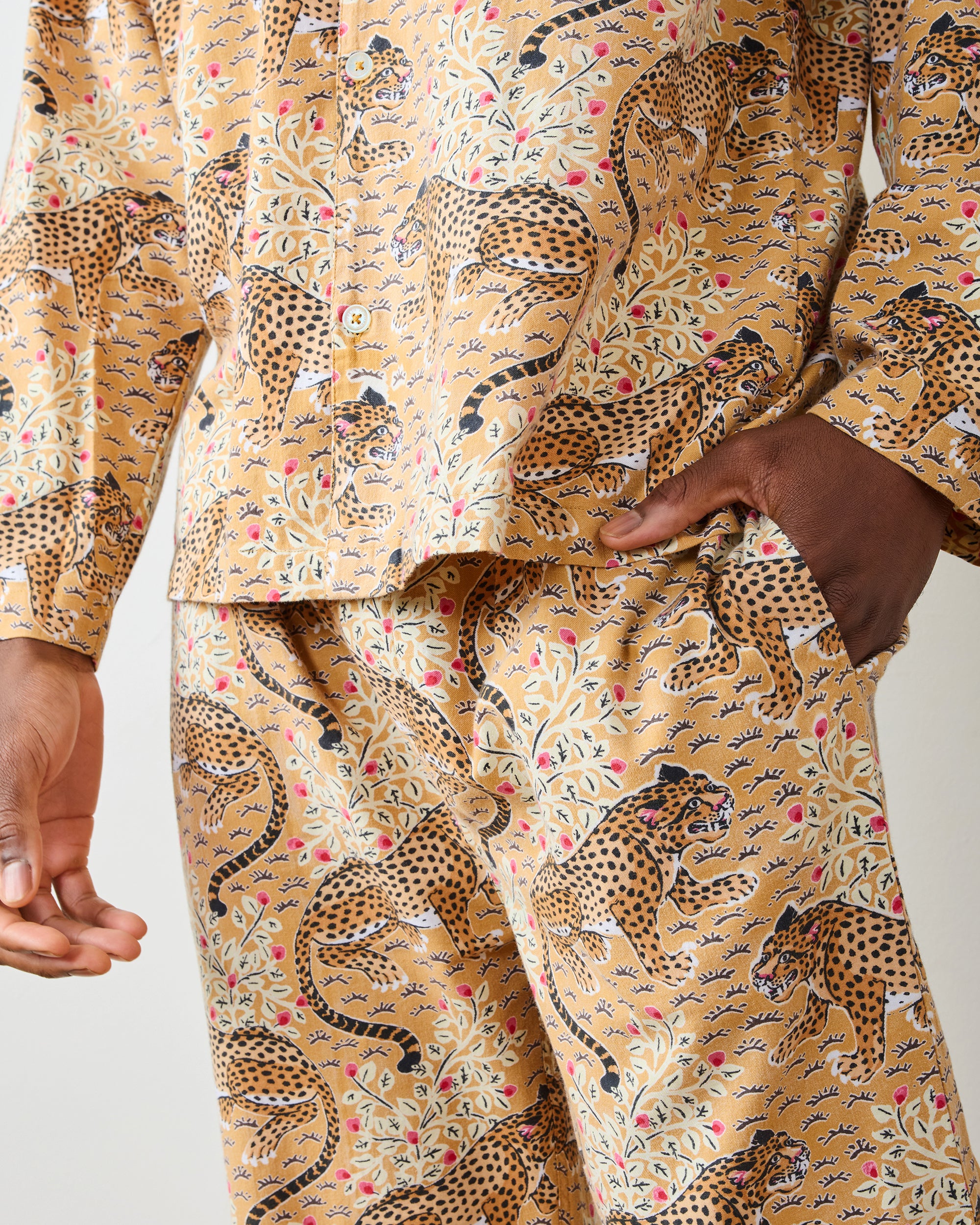Channel your inner jungle cat with our classic men’s flannel pajama set. Inspired by vintage textiles, this leopard print sleepwear features our Bagheera cats among decorative flora on lightweight organic cotton flannel. These relaxed Tobacco brown pajamas include a relaxed button-down and comfortable pants with pockets. Made for cozy evenings in luxurious style. Explore more hand-drawn prints in our , , and .