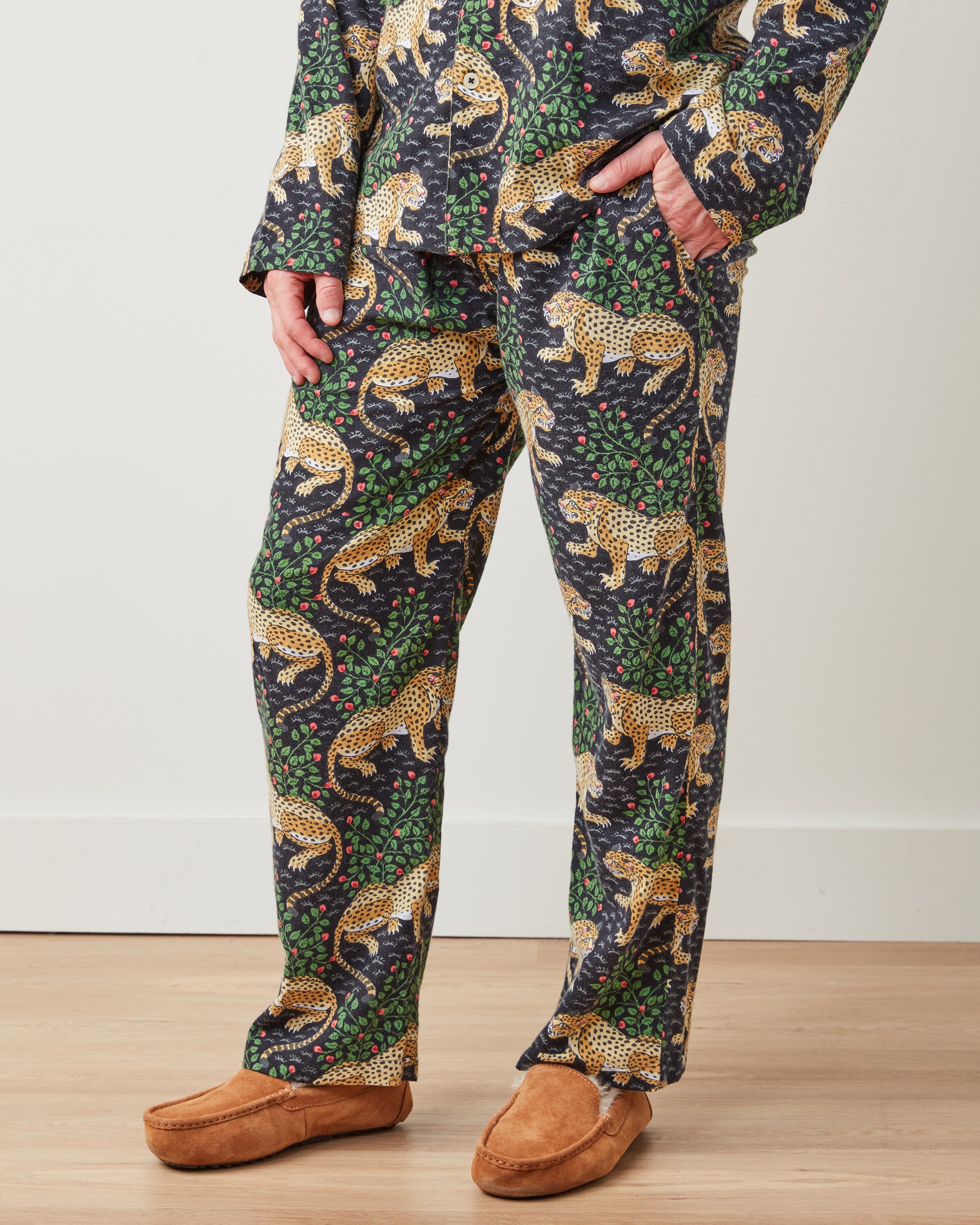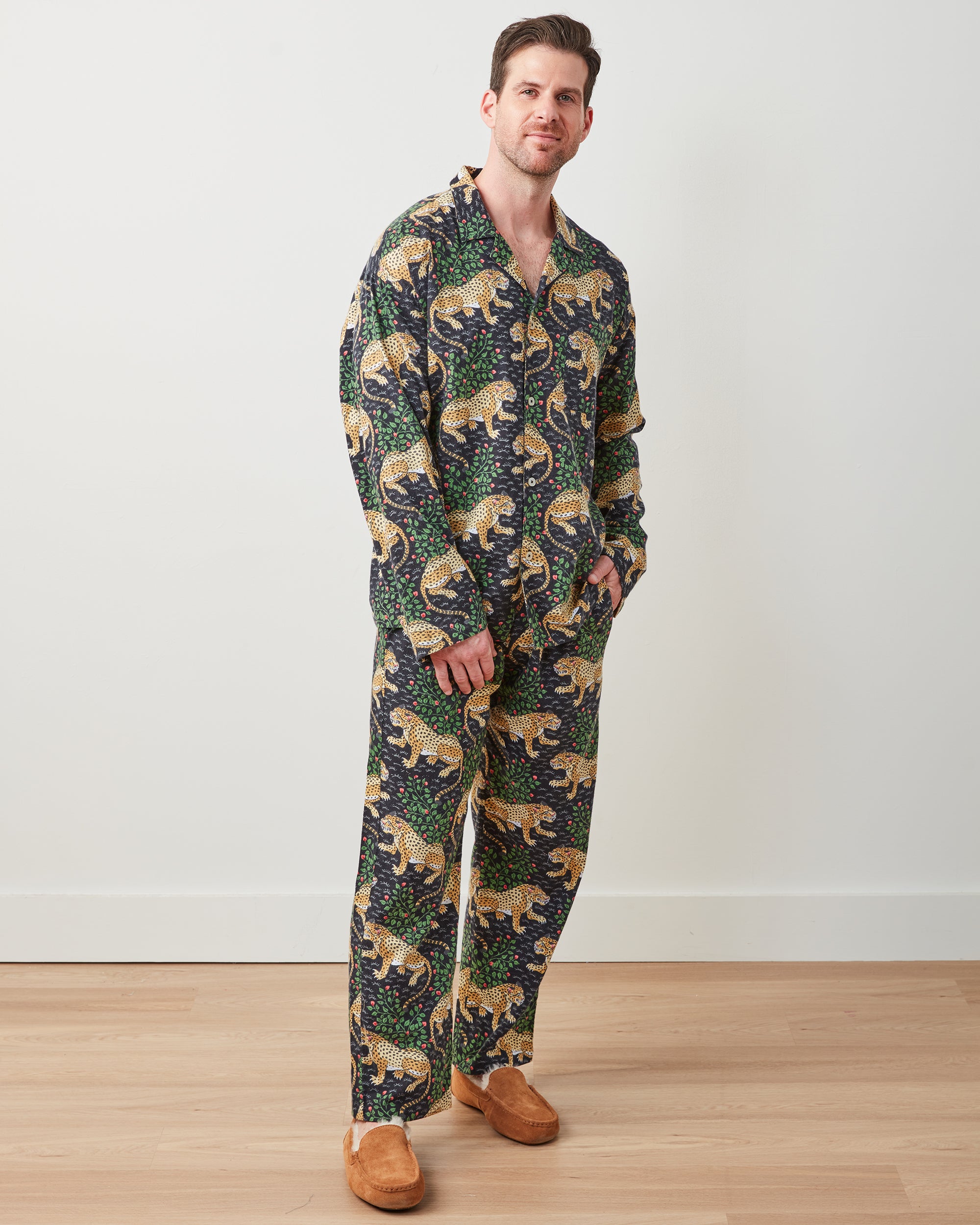Channel your inner jungle cat with our Bagheera men’s flannel pajama set in rich Ink. Our iconic leopard pajamas feature antique jungle cats and flora on lightweight organic flannel, perfect for chilly evenings. The roomy button-down top and relaxed pants with pockets deliver comfort while keeping you cozy. A sophisticated take on men’s flannel pajamas. Explore our and for more hand-painted prints.