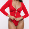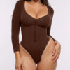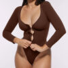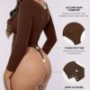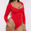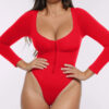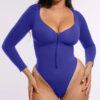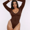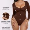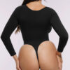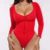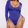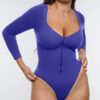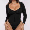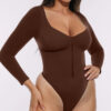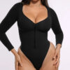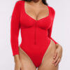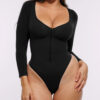 This long-sleeve bodysuit redefines all-day shaping with seamless comfort. Its sculpting 4-way stretch fabric and structured cups offer flawless support, while the invisible thong back disappears under clothing. Designed for effortless wear with a smooth zip-front and quick-release snaps, it’s your secret to confidence!