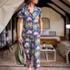 - Fit: Button-down top with relaxed fit that’s roomy and chic. Mid-rise pants with elastic waistband, adjustable drawstring, and 22″ inseam.