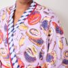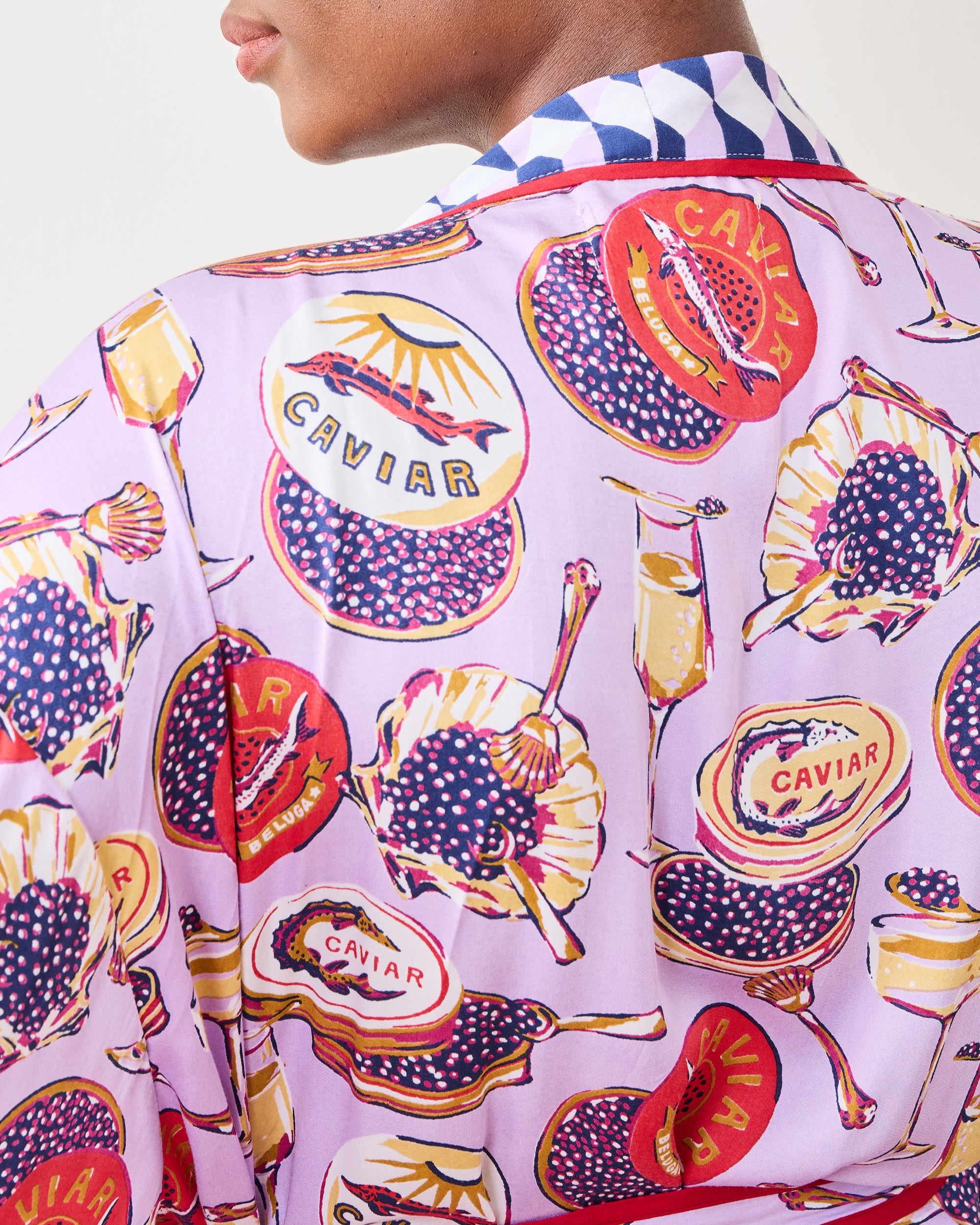 Celebrate with our Champagne & Caviar satin robe in Lavender Spritz. This champagne print sleepwear features hand-painted retro caviar tins and bubbly flutes on silky Eco Satin. The elegant full-length design includes deep pockets and dual closure options for your perfect fit. A luxury lounge robe made for champagne toasts at sunset or leisurely mornings. Explore more , and .