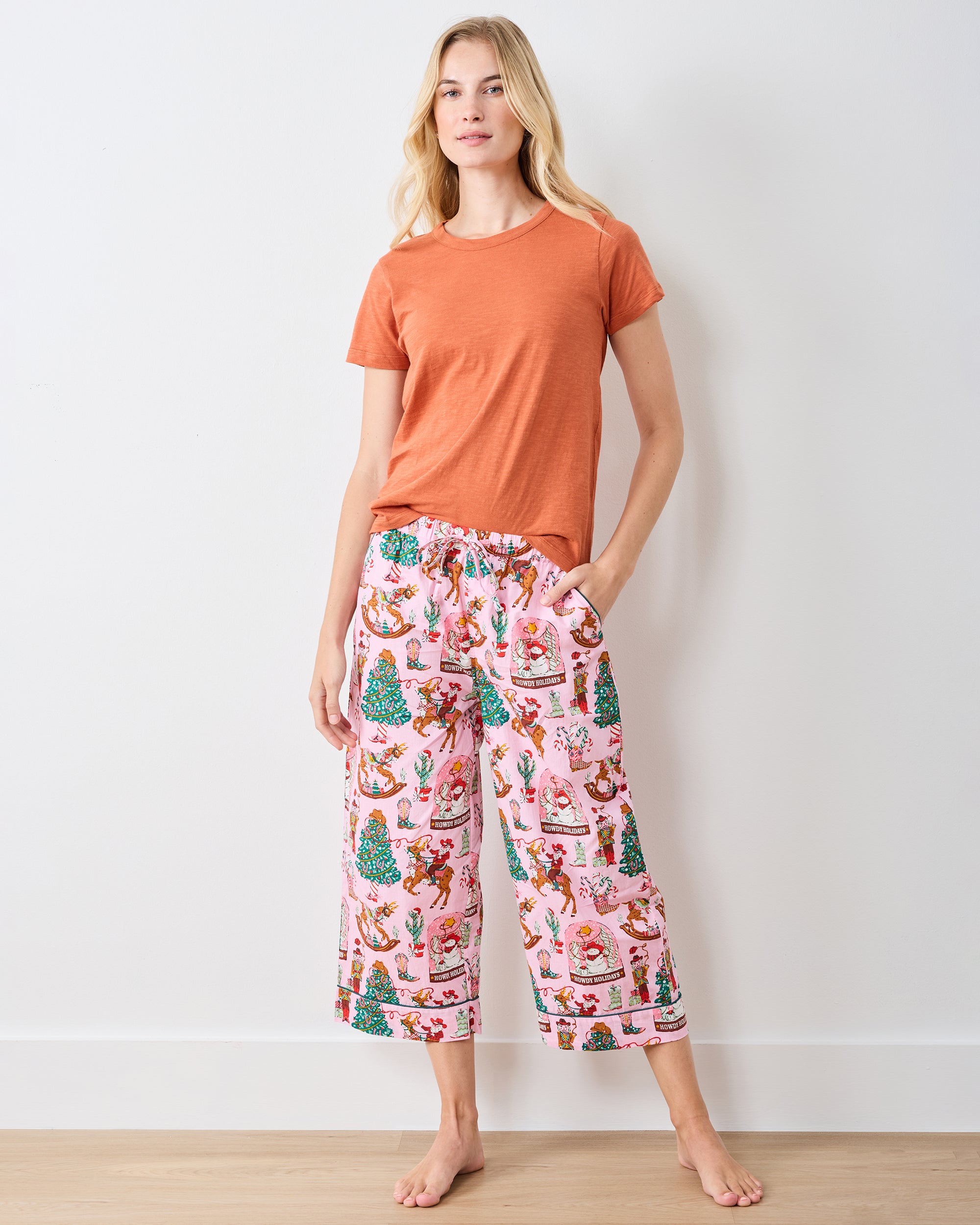 Bring wild west charm to your holidays with our Cowboy Christmas cropped PJ pants. These playful Western cotton PJs feature Santa riding reindeer while roping Christmas trees on breathable organic cotton. The comfortable mid-rise fit and perfectly cropped length make these Christmas PJ pants ideal for festive lounging, complete with pockets for treats. Explore our and for more styles.