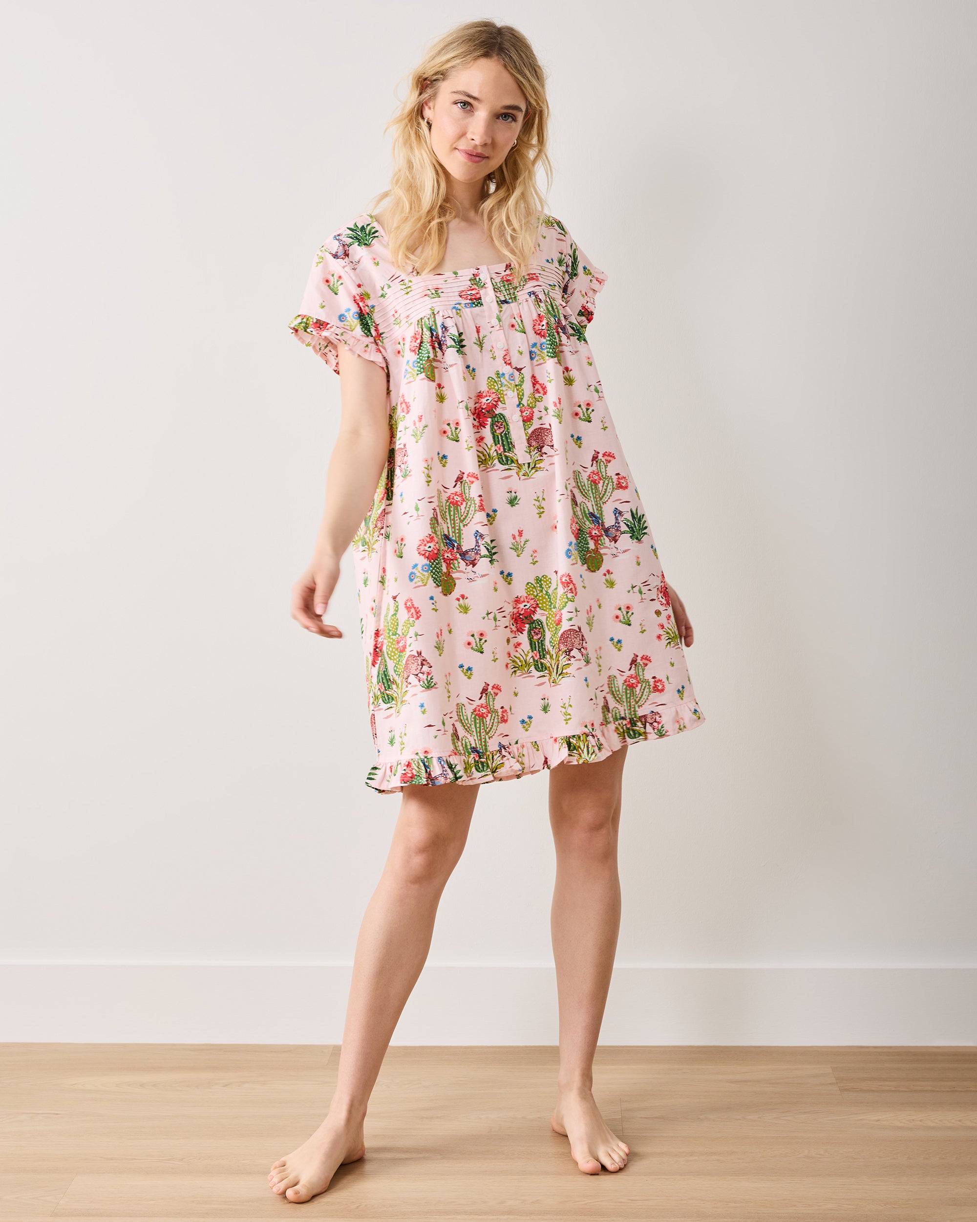 Slip into the cactus print nightgown, a breathable, 100% organic cotton sleep dress featuring hand-drawn cacti and desert critters on a soft pink backdrop. This cotton nightgown is designed for easy movement and warm-weather comfort, and includes pockets for your nighttime essentials. It’s the perfect pink nightgown for women who love playful prints. Explore more and .