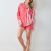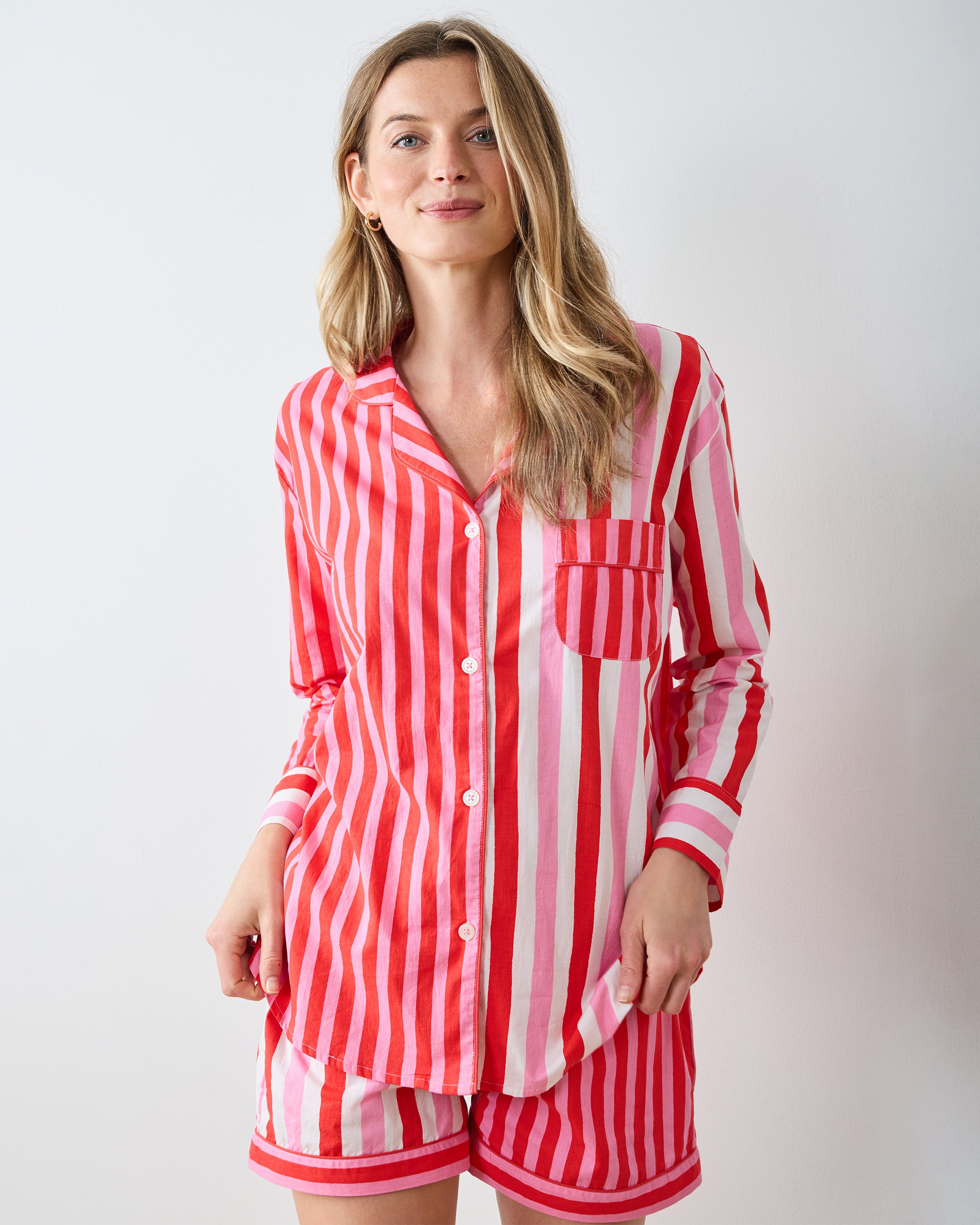 Sweet dreams meet timeless style in our Gift Wrapping pajama shorts set. This peppermint PJ set features a classic striped design with a playful holiday twist on breathable organic cotton. The cozy long-sleeve top pairs perfectly with comfortable striped pajama shorts with pockets for festive lounging. A sweet holiday pajama set for sipping peppermint hot chocolate. Discover more styles in our and .