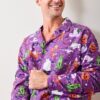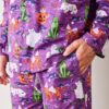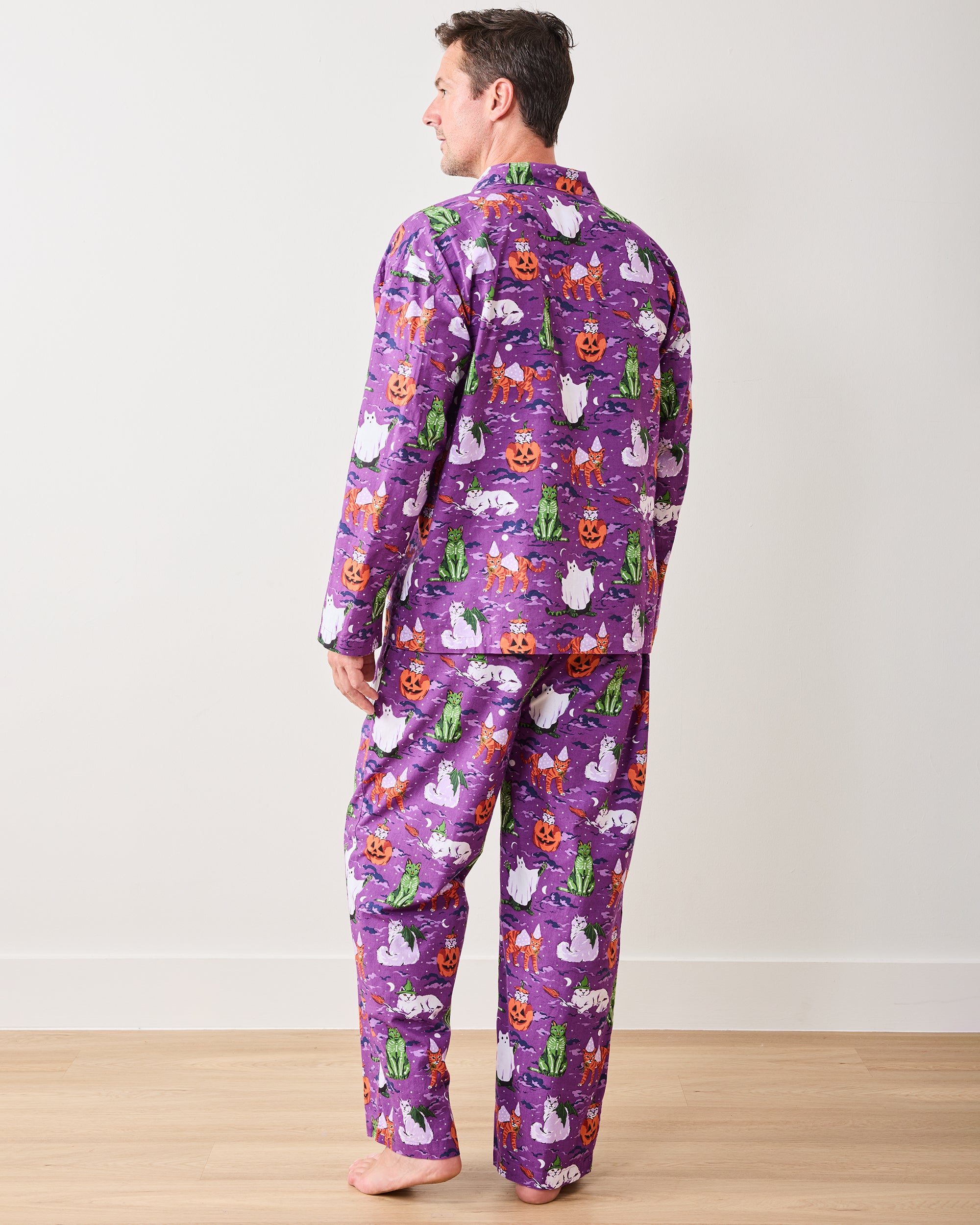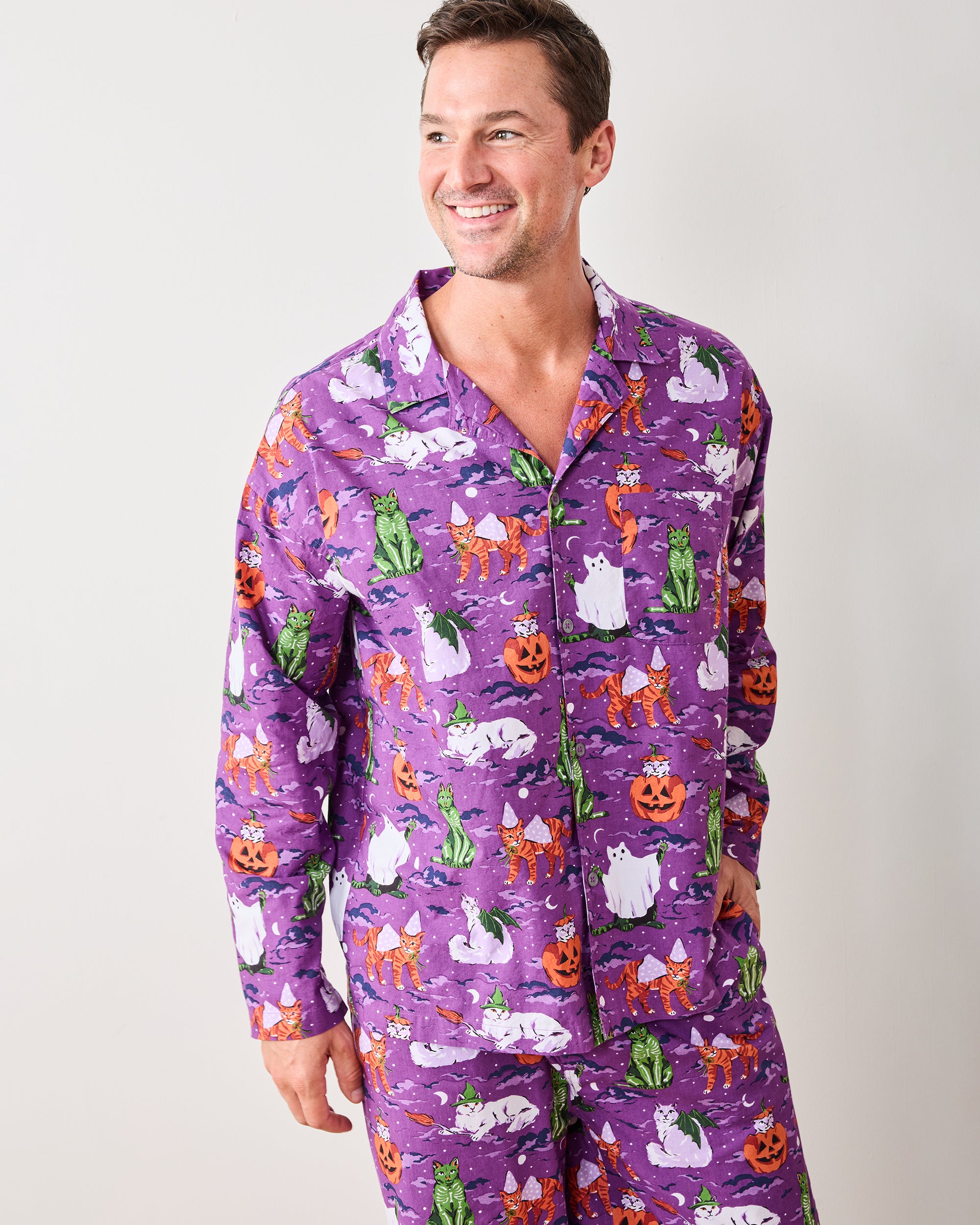 Our Halloween House Cats are back in this men’s PJ set, in rich Purple Tonic. This cotton men’s sleepwear features costumed cats on breathable organic cotton that softens with every wash. With a roomy classic button-down, relaxed pants, and deep pockets, it’s a fall lounge set made for cozy lounging and handing out treats. Explore more in our pajama sets and men’s collection.