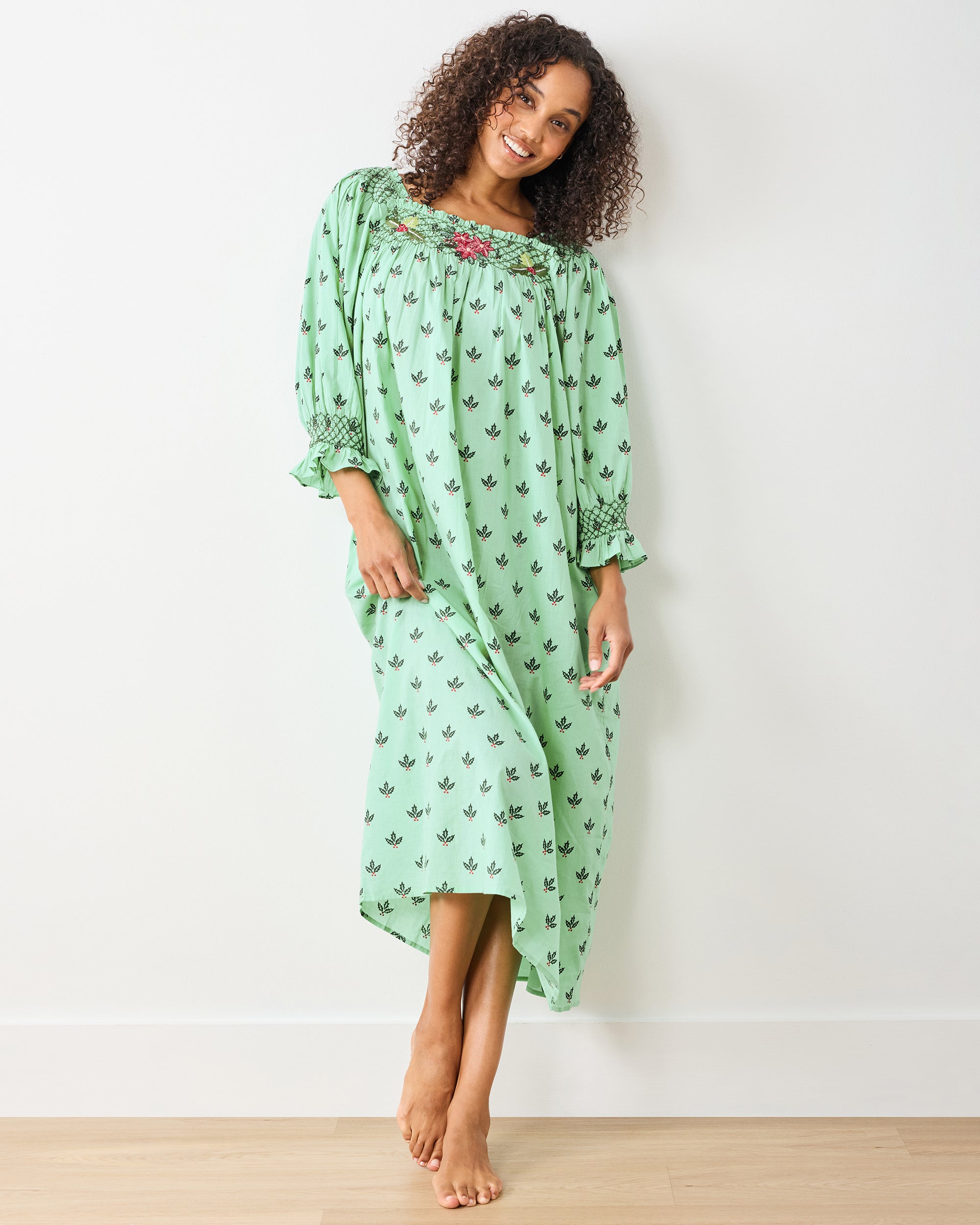 Deck your evenings with Holly Berry, with our Parker Nightgown in serene Sage. Delicate embroidered holly adorns a comfortable smocked bodice, while the sweeping maxi silhouette offers graceful coverage. Crafted from breathable organic cotton cambric with deep pockets, this holiday nightgown is perfect for Christmas morning magic. A festive cotton nightdress for cozy December nights. Discover more hand-drawn prints in our , , and .