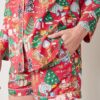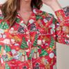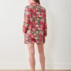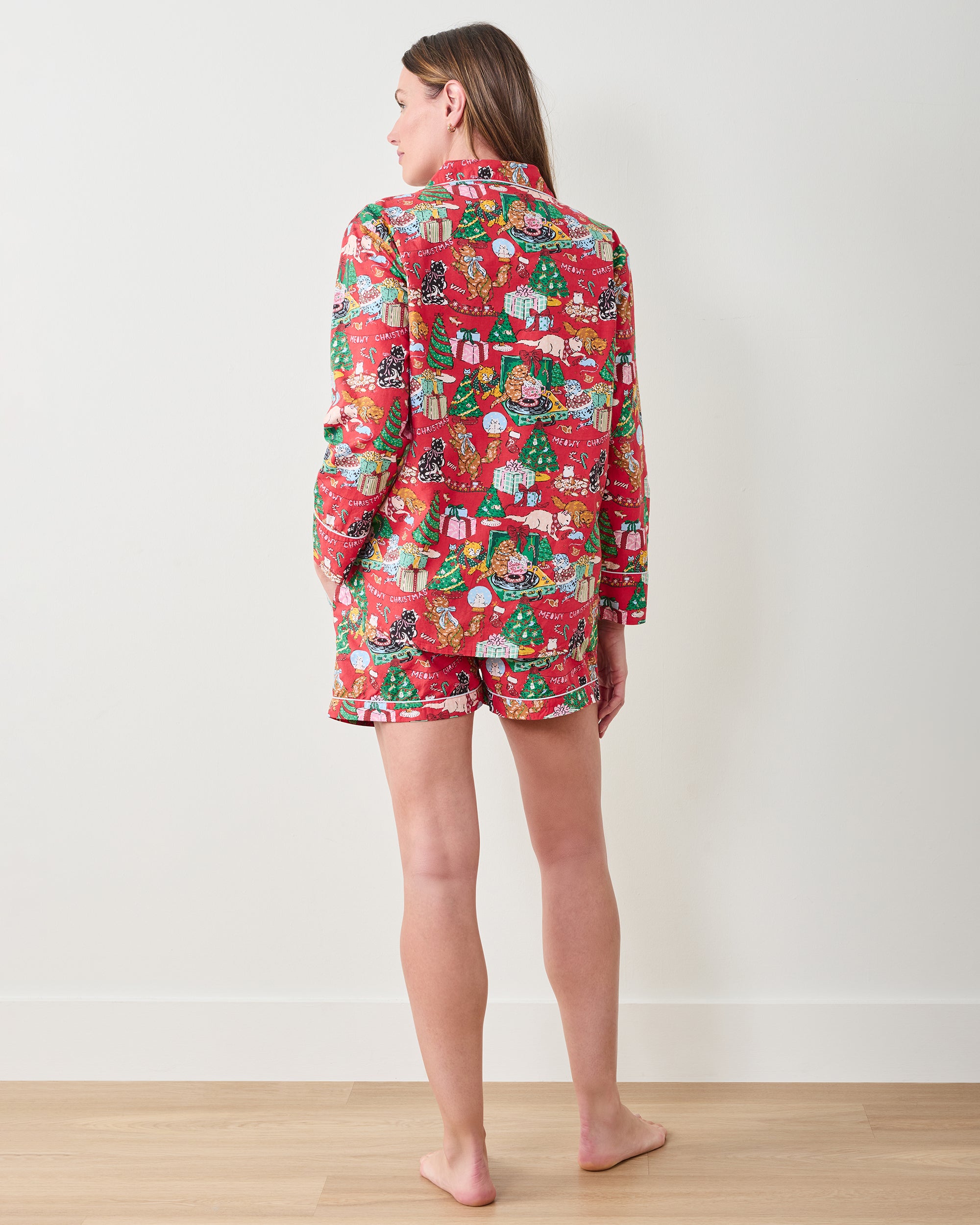 Drift into holiday magic with our Meowy Christmas cat PJ set in Red Bow. This festive cotton PJ set features playful felines decking the halls across breathable organic cotton. The cozy long-sleeve pajama top offers relaxed button-down styling, while the cat PJ shorts include pockets and adjustable drawstring comfort. Makes a delightful gift for cat lovers. Discover more whimsical prints in our and .