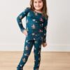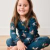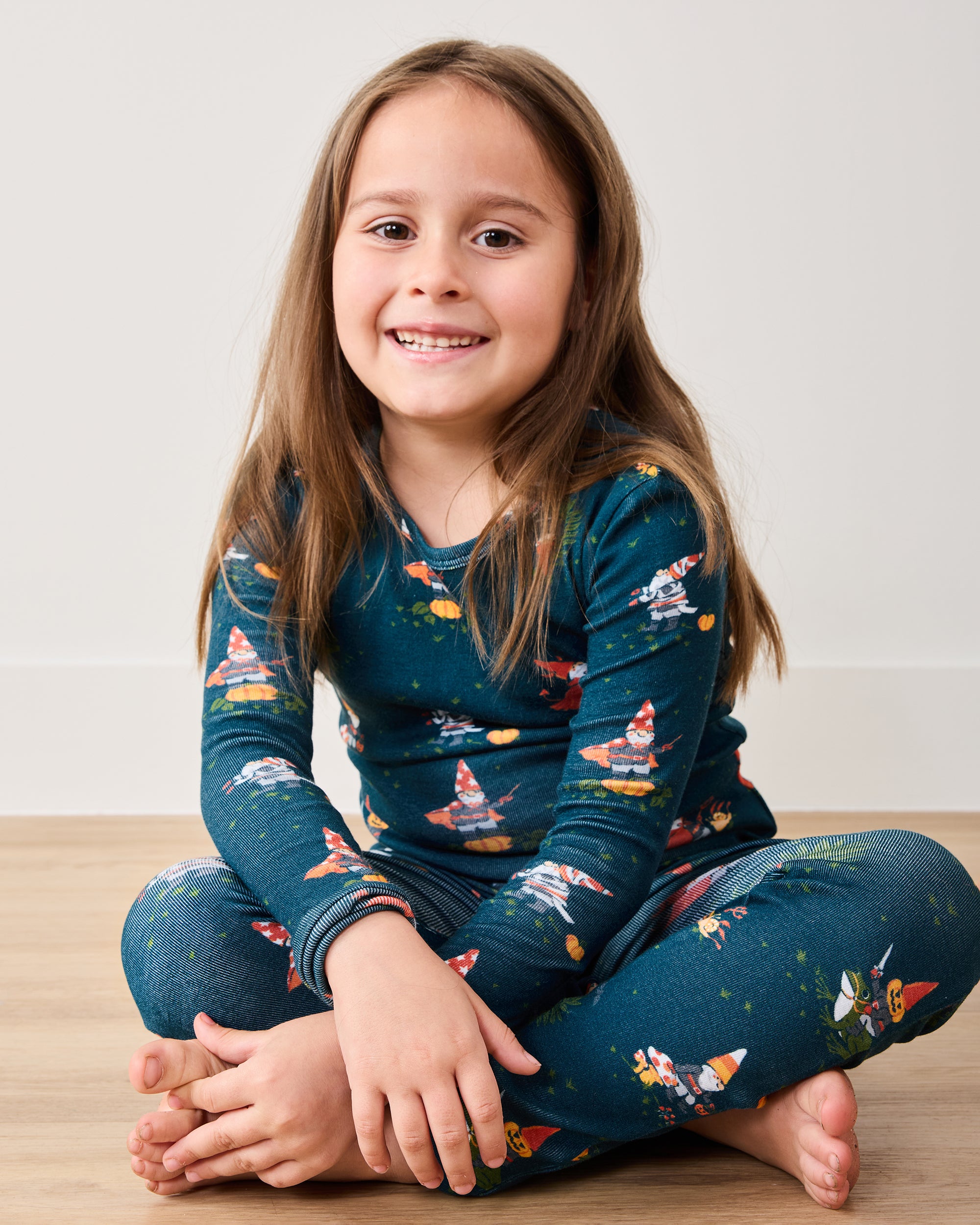 Halloween mischief meets bedtime bliss with our Mischief Night kids’ PJs set. Playful gnomes ride frogs and play dress-up across this Nightfall Blue kids sleepwear set. The snug-fit design of these Halloween kids pajamas, made from breathable 100% cotton, keeps little ones cozy all night, with a touch of silly charm to spark imagination. Explore our matching family pajamas and pajama collections for more charming prints.