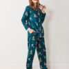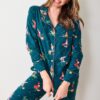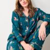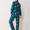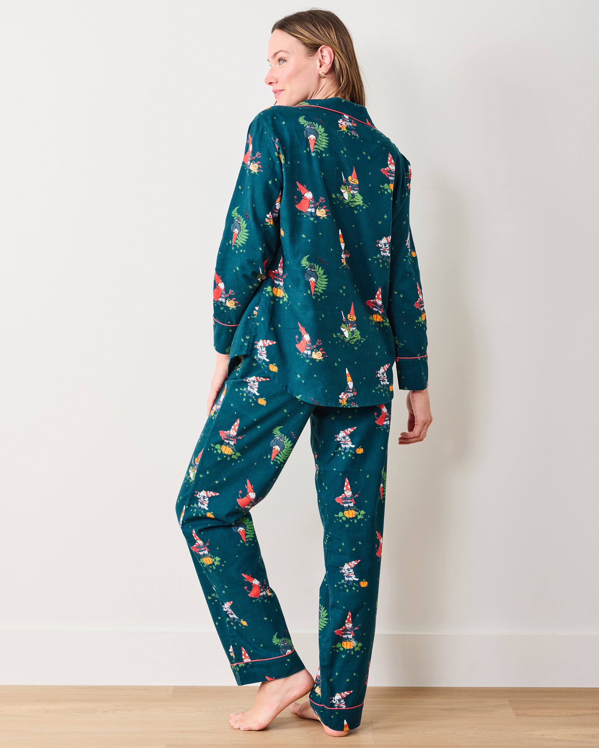 Embrace the spirit of mischief with our flannel PJ set in Nightfall Blue. Featuring playful gnomes with frogs and pumpkins, on soft, lightweight flannel, this print adds a touch of silly charm to your October loungewear. This Halloween pajama set features a relaxed-fit top and full-length pants with pockets. Perfect for cozy movie marathons. Explore our pajama sets, flannel pajamas, and navy flannel pjs.