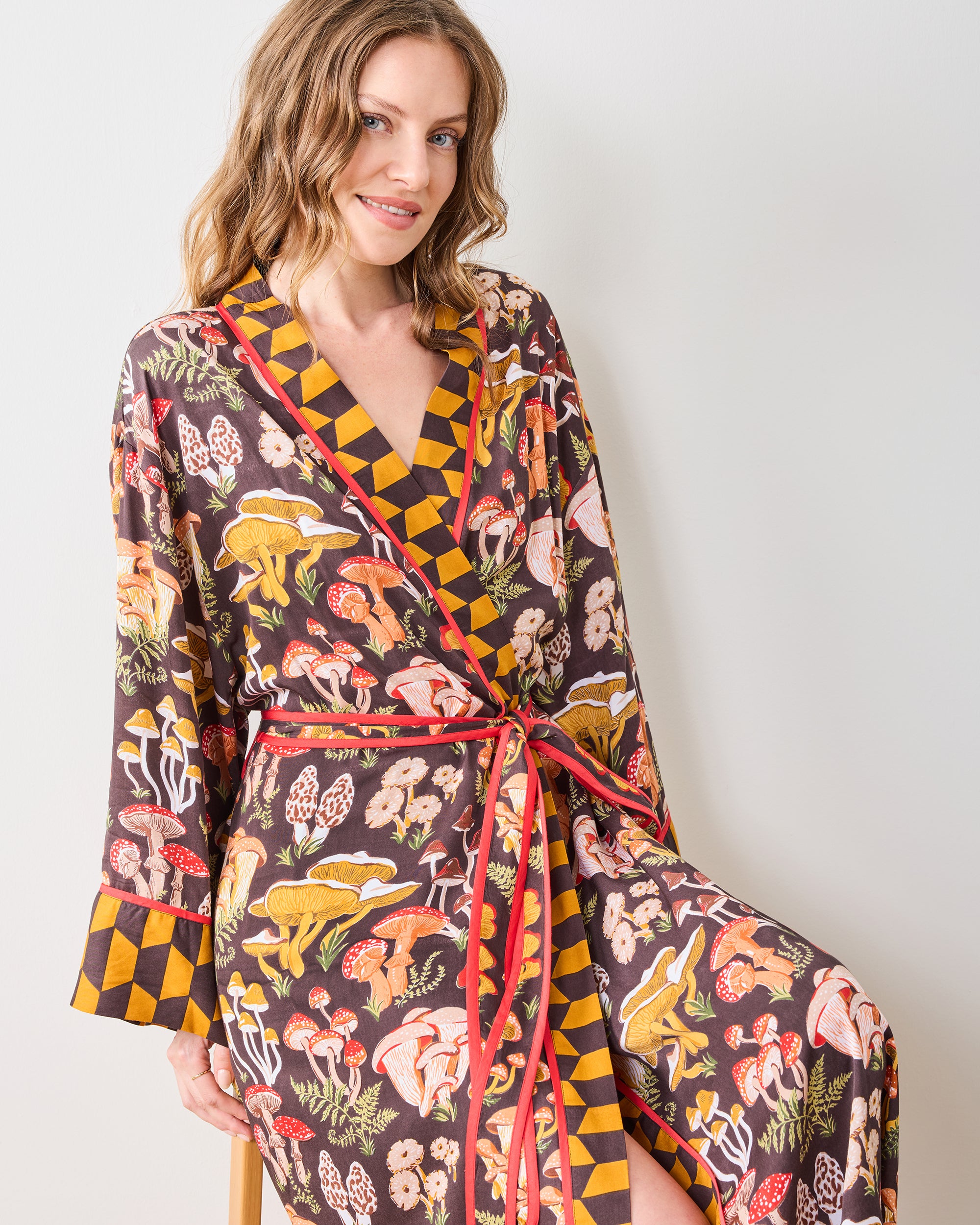 Wrap yourself in woodland magic with the mushroom print satin robe, featuring a whimsical design inspired by foraging and forest trails. This women’s long satin robe is crafted from Eco Satin, with a soft drape for everyday luxury and a touch of cottage-core charm. Complete your loungewear look with pieces from our and collections.