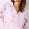 Greet the season in our October Traditions Halloween pajama set in soft Purple Spell. Embroidered jack-o-lanterns, witch hats, and seasonal icons dance across these purple pajamas. This cotton sleep set features a relaxed-fit button-down top and comfortable pants in breathable organic cotton. Perfect fall loungewear for cozy breakfast preparations. Please note, this style does not include pockets.