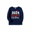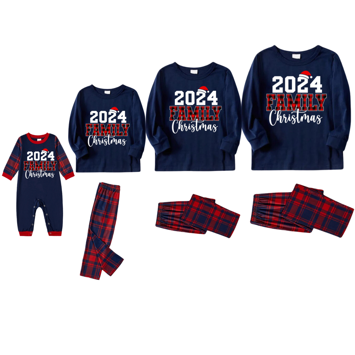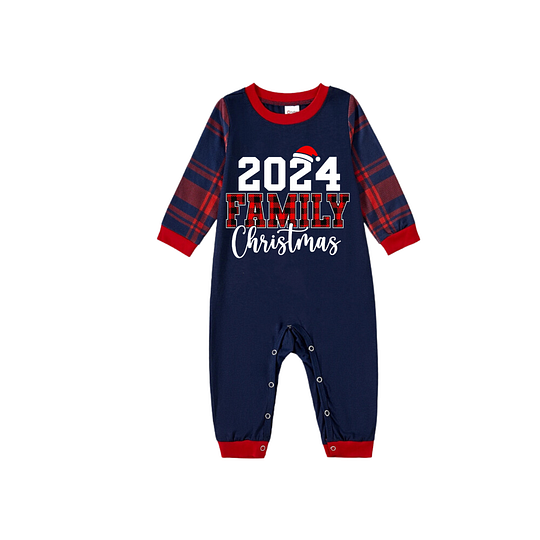 Santa Hat Prints Blue Long Sleeves Top with Red and Blue Plaid Pants Christmas Matching Pajamas