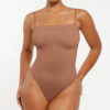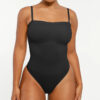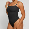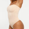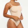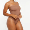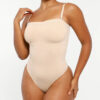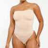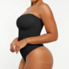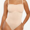 The Bare Essentials™ Skin Flow™ Strapless Sculpt Thong Bodysuit provides bust support, tummy flattening, and waist-cinching for a smooth silhouette. With pique stitching, a snap closure, and removable adjustable straps, this eco-friendly bodysuit ensures all-day comfort and seamless body sculpting.