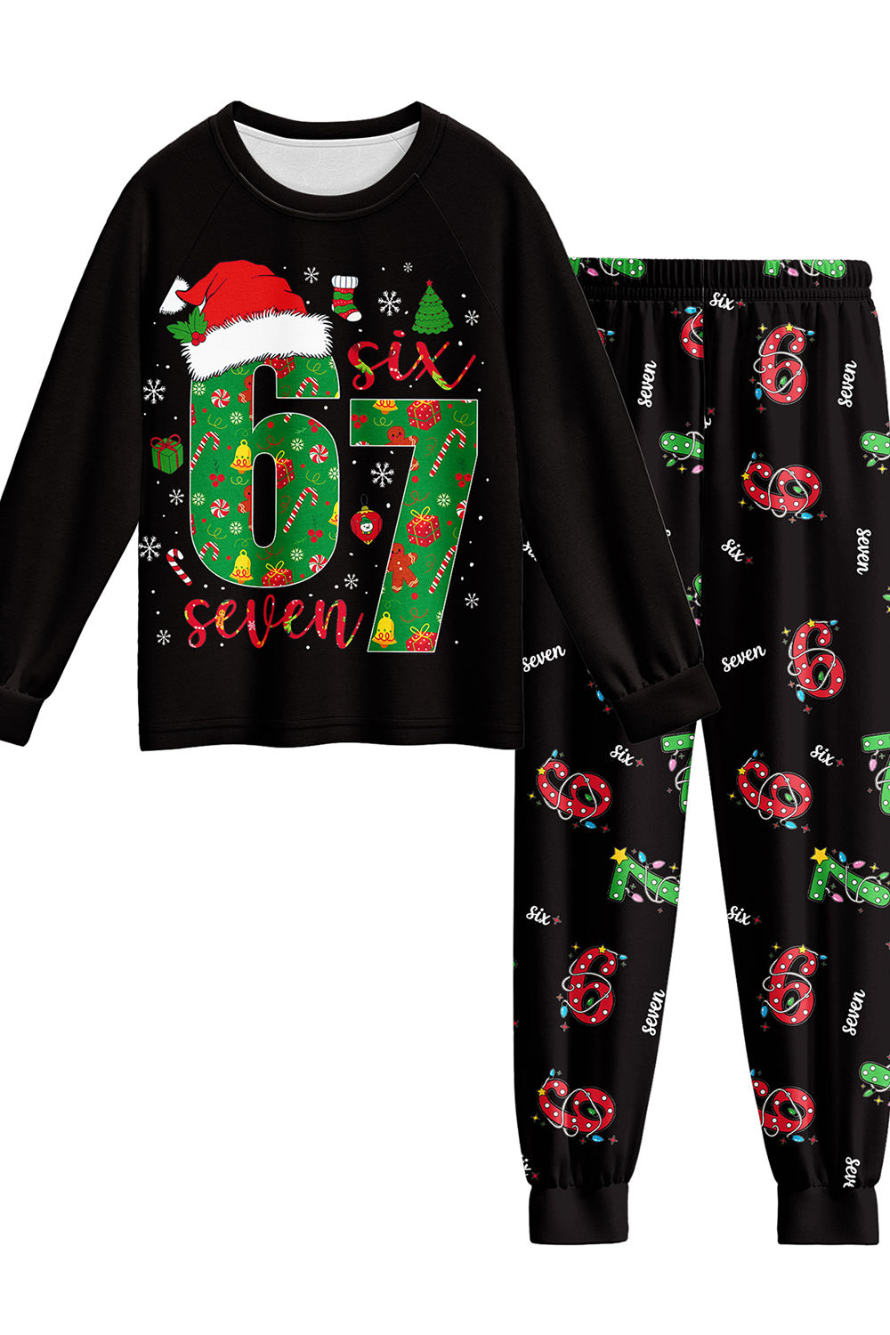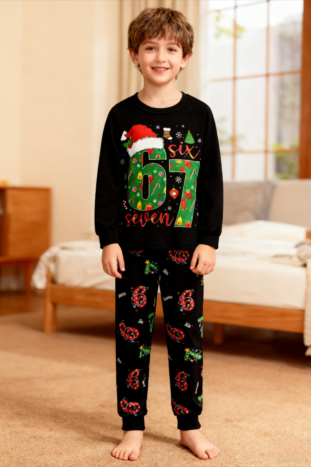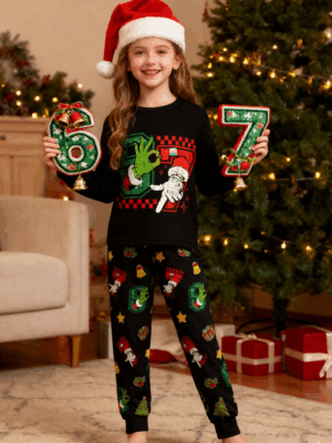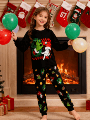 SIX SEVEN Prints with a Tiny Santa Hat Festive Trees and Gifts Kids’ Pajamas Set