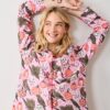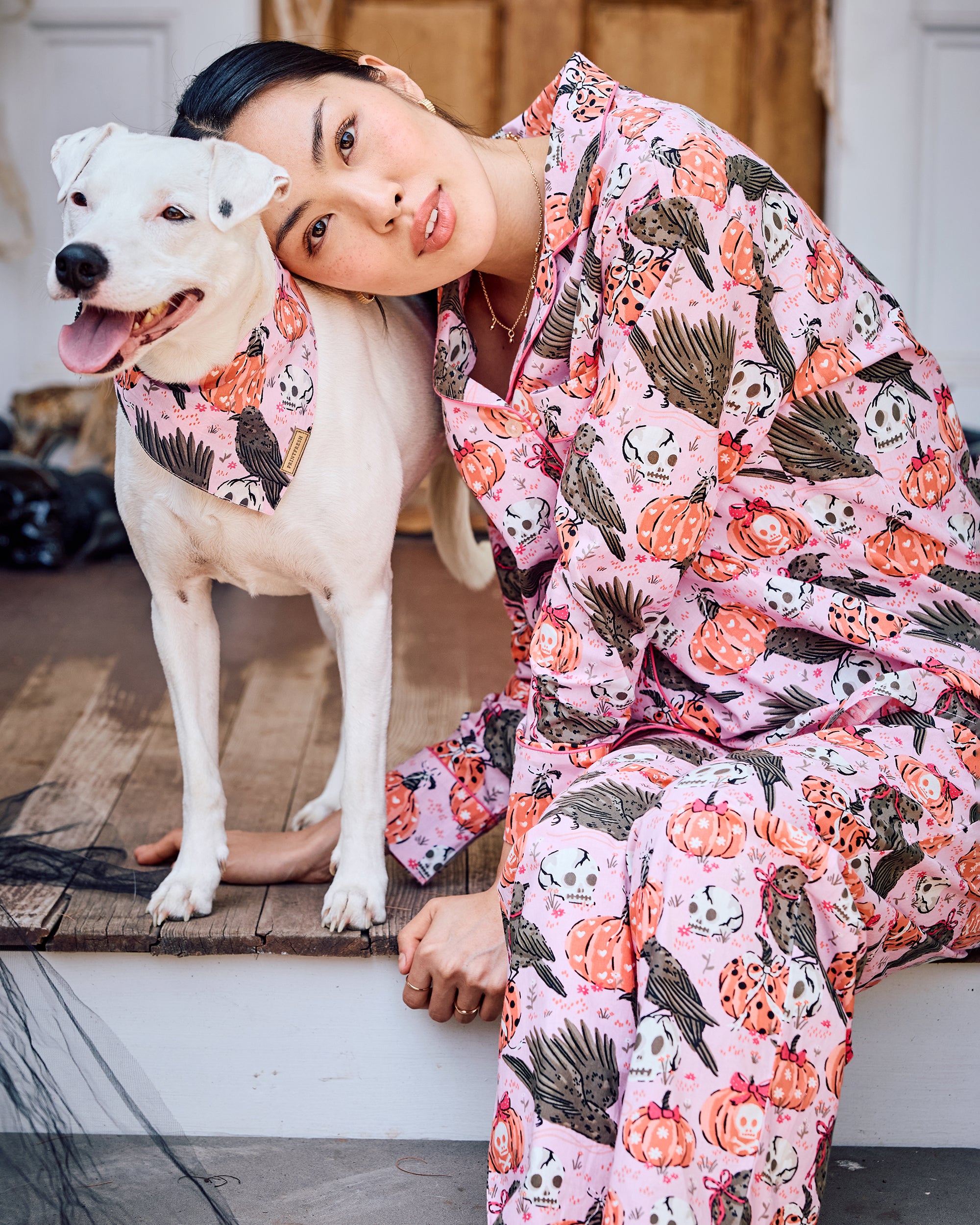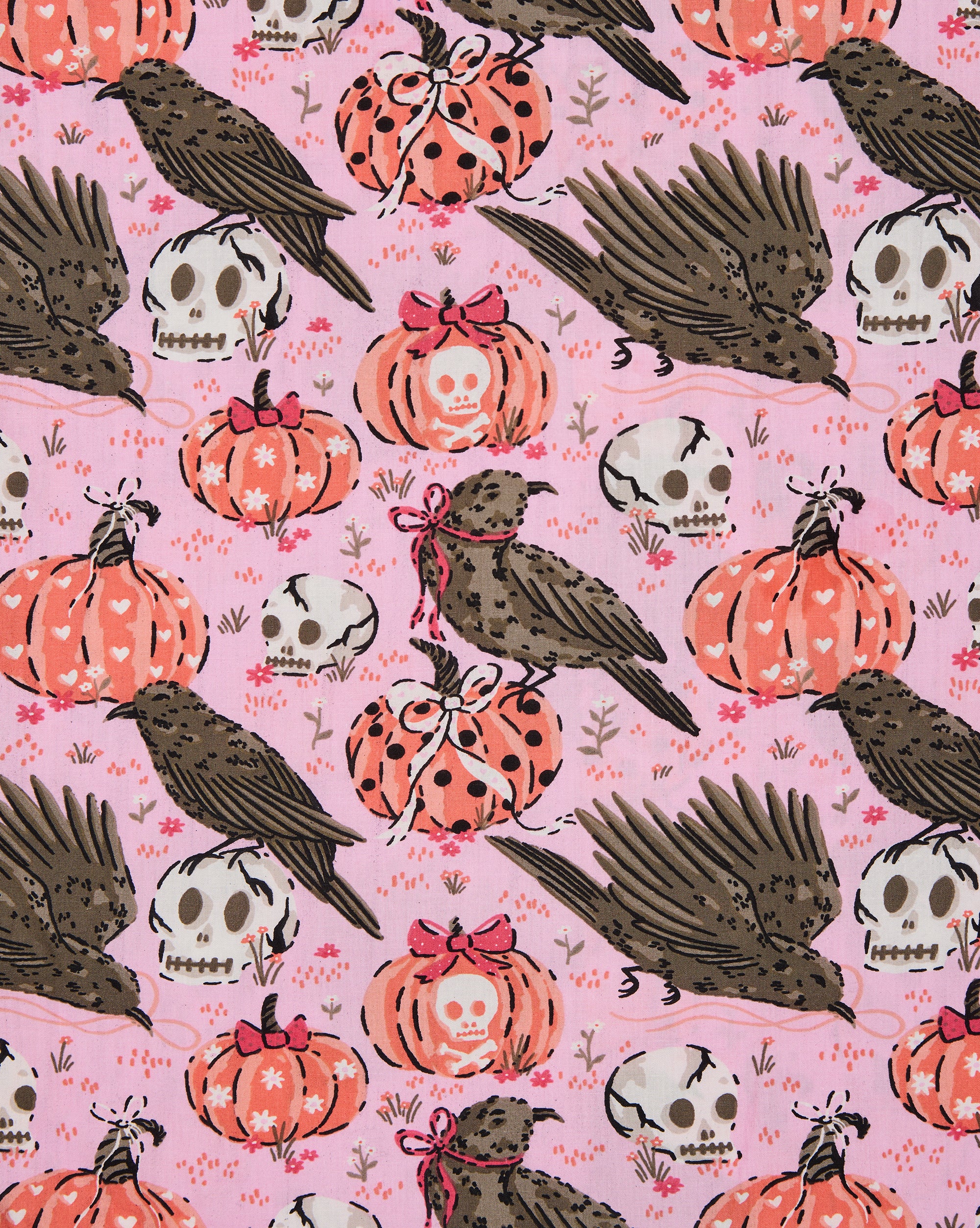 Playful pumpkins, charming crows, and cute skulls dance across our Sleepy Hollow Halloween pajama set in soft pink. This cotton PJ set combines festive autumn motifs with breathable organic cotton for October nights that feel magical. This button-down sleepwear features a relaxed-fit top and comfortable pants with pockets, perfect for cozy evenings in.