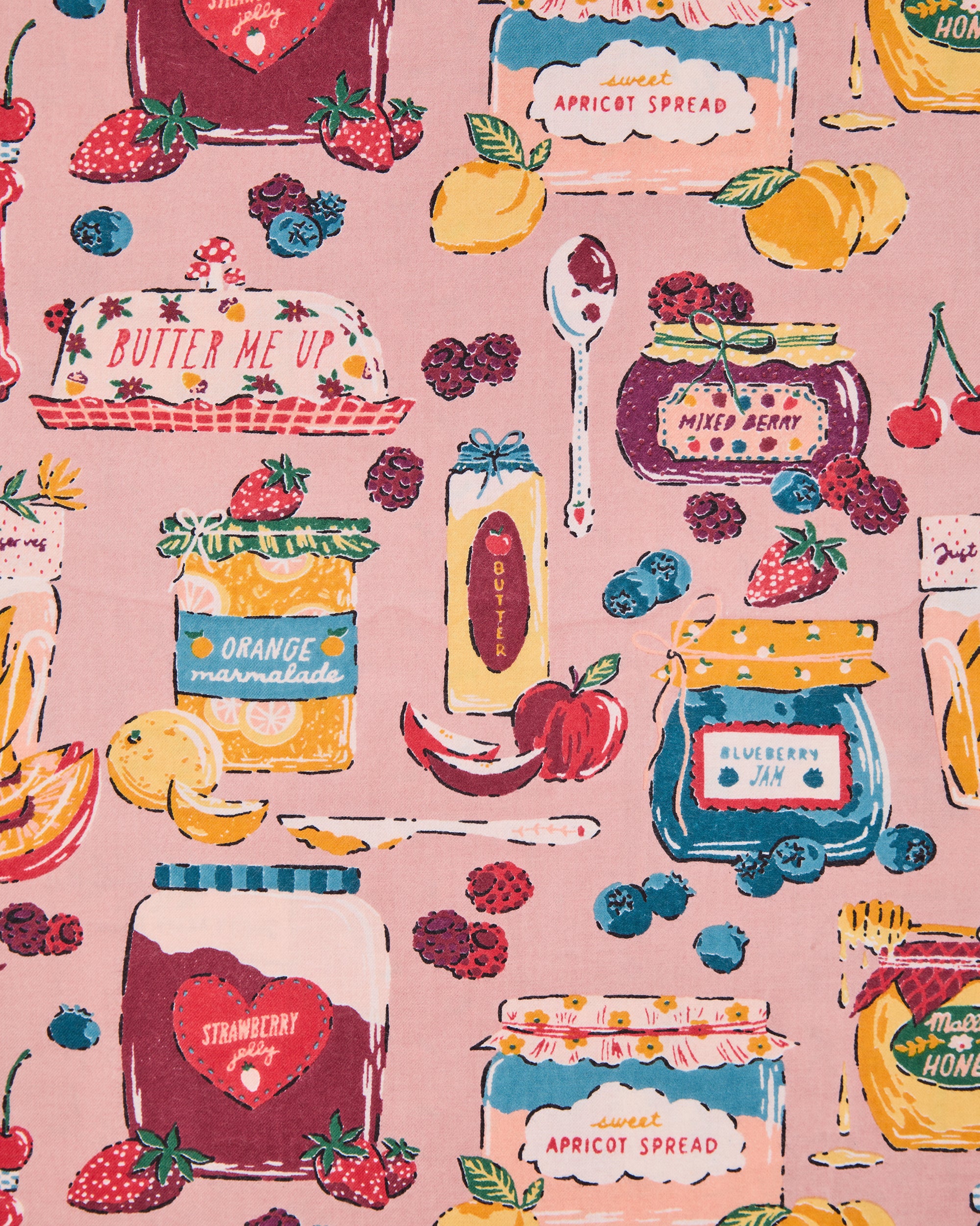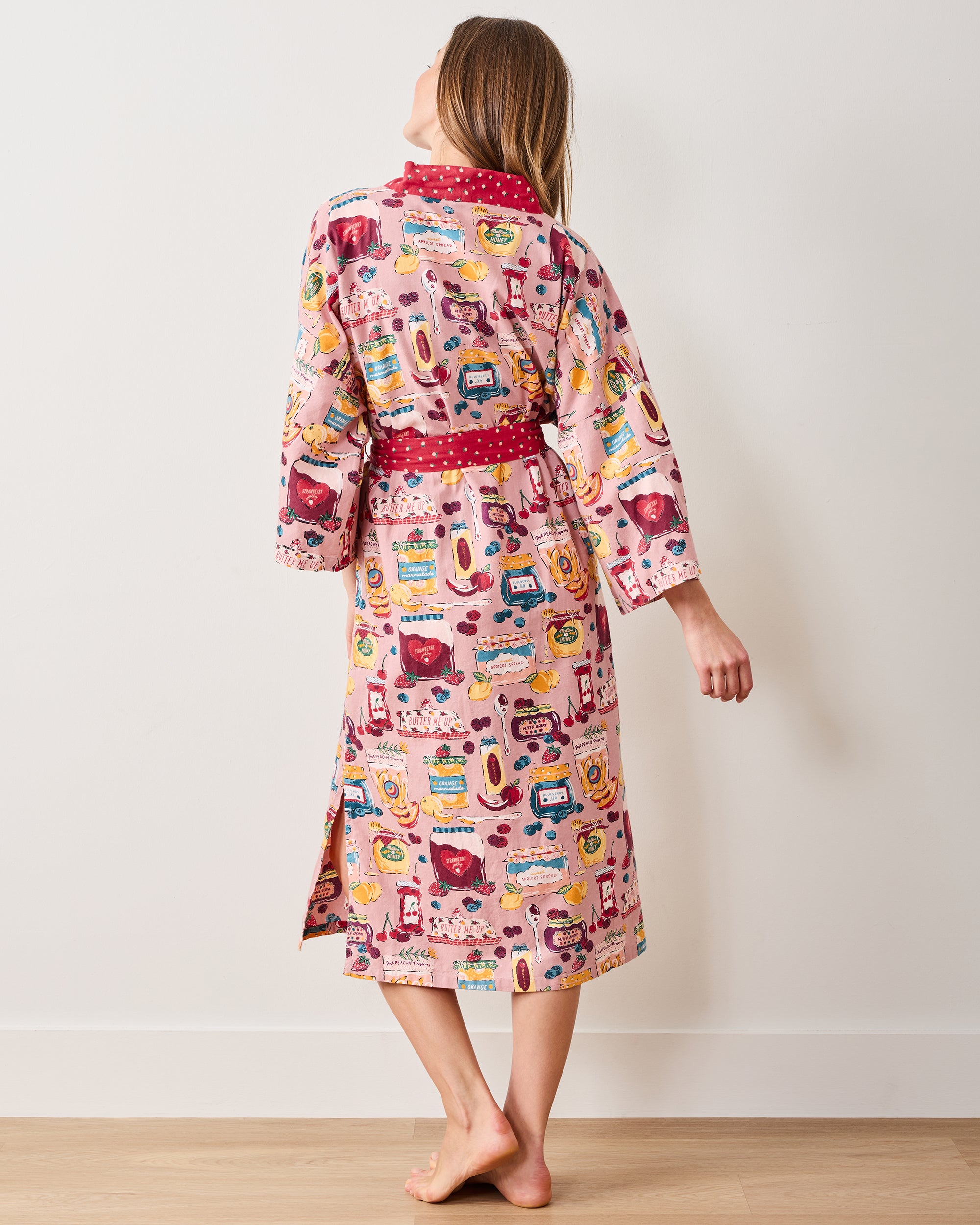 Sweet nostalgia meets morning comfort in our Sweet Jams lightweight robe. Hand-screen-printed fruits and jam jars dance across soft, berry-hued flannel, celebrating the simple pleasure of slow living. This robe offers elegant full-length coverage with deep pockets for your morning essentials. Perfect for preserving precious weekend moments at home. Discover more cozy layers in our collection and .