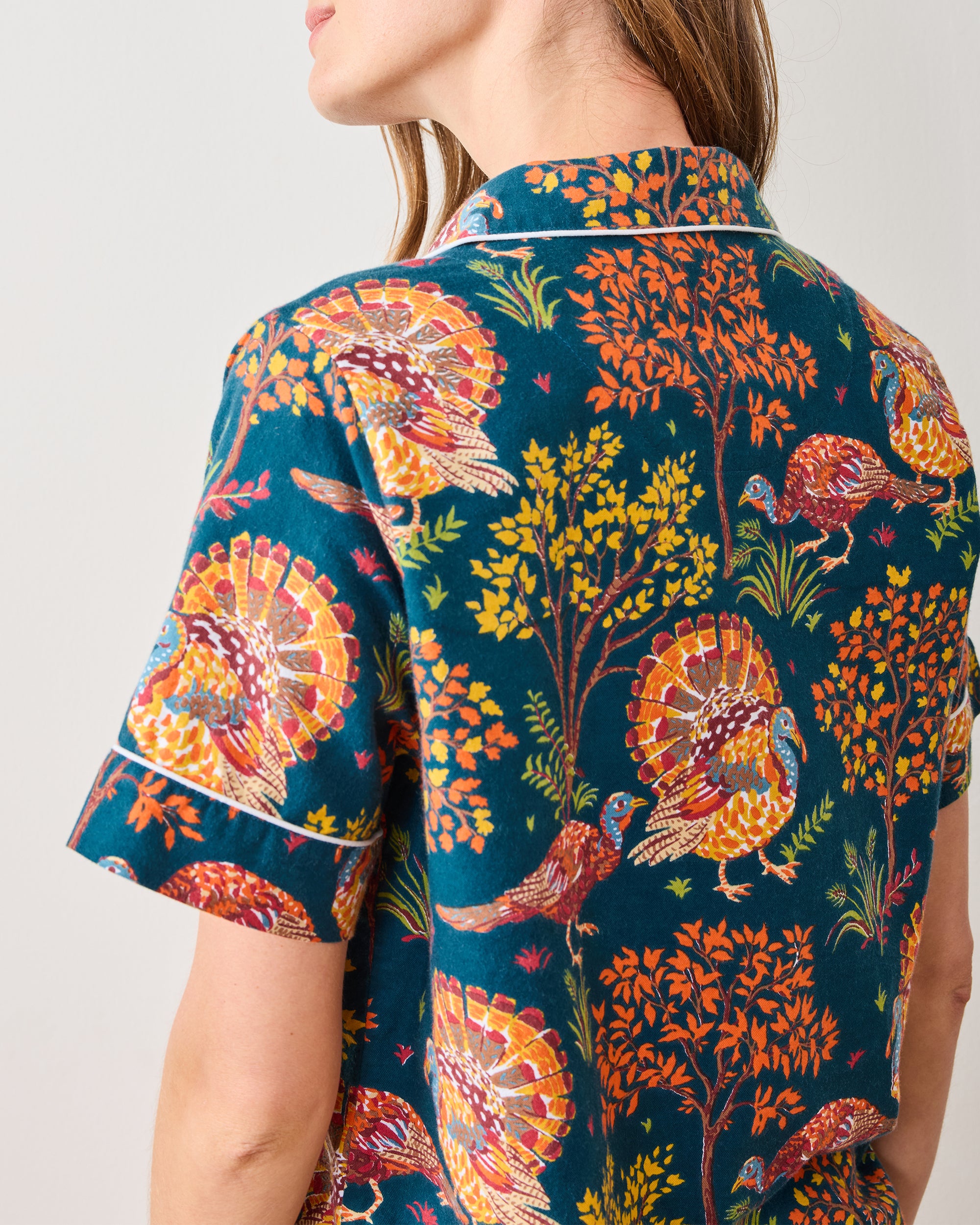 Celebrate fall comfort in our Turkey Trot short pajama set. This playful hand-drawn turkey print sleepwear features whimsical birds wandering through autumn foliage on rich navy loungewear. Our lightweight flannel offers cozy-yet-breathable comfort, while the relaxed top and shorts with pockets make these cozy fall PJs perfect for Thanksgiving downtime. Explore our , , and for more joyful prints.
