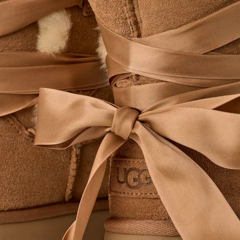 Our Bailey Tie is such a natural evolution of our Classics, we can’t believe it’s just arrived. A new take on our beloved Bailey Bow boot, the Bailey Tie features a lace-back design that can be worn in multiple ways. Style the boot with the overlapping ticked lace, or switch to the bonus satin laces for a softer vibe. Crafted with plush and premium sheepskin, the upper can be worn tall or cuffed to expose the fluffy inner side of the Twinface sheepskin. Whichever way you wear it, our Bailey Tie delivers your favorite Feel of UGG®.