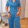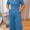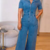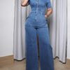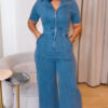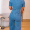Women’s Casual Short Sleeve Loose Straight Leg Demin Jumpsuits with Pockets
