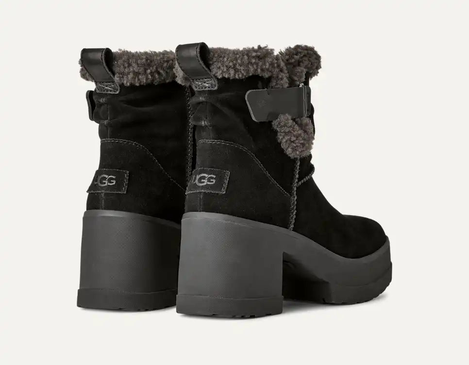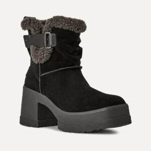 Our Moxy Pull On takes the bold lug tread of our Brooklyn and infuses it with a rich mix of suede and leather. Steeped in UGG® heritage, this boot has The Twin Seam details and a plush, curly sheepskin collar. It’s boosted on a 3.2′ platform and 4.5′ heel made from lightweight rubber with an EVA fill.